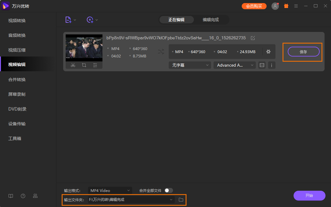 完成添加后,点击确定按钮,视频将出现在列表当中,在输出文件夹选择文件保存的位置,然后点击保存按钮即可完成。