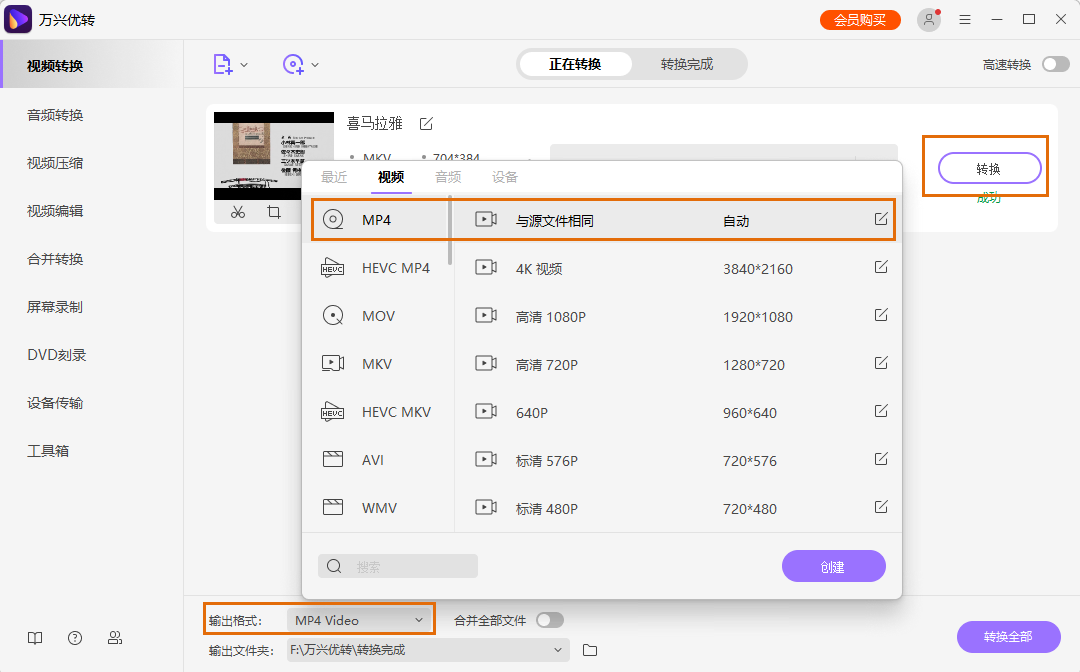 如果你需要改变视频的输出格式和清晰度,点击左下角“输出格式”按钮选择转换至的格式,同时点击右边的创建图标更改视频的输出质量。最后点击转换按钮完成所有工作。