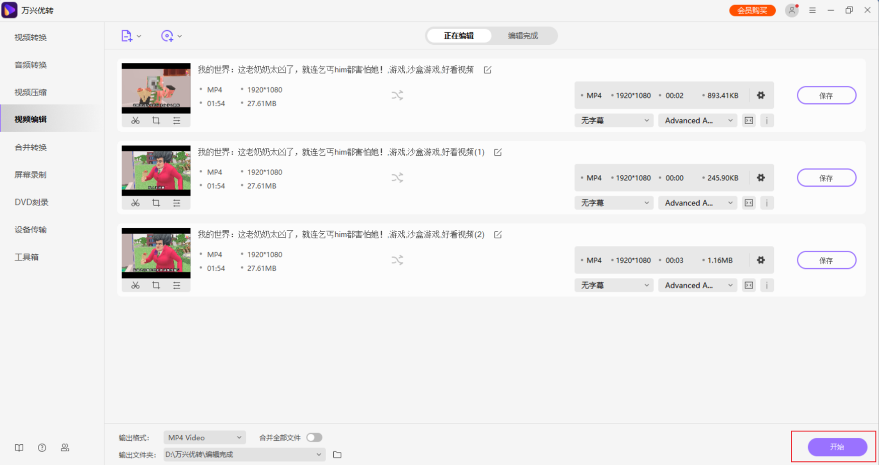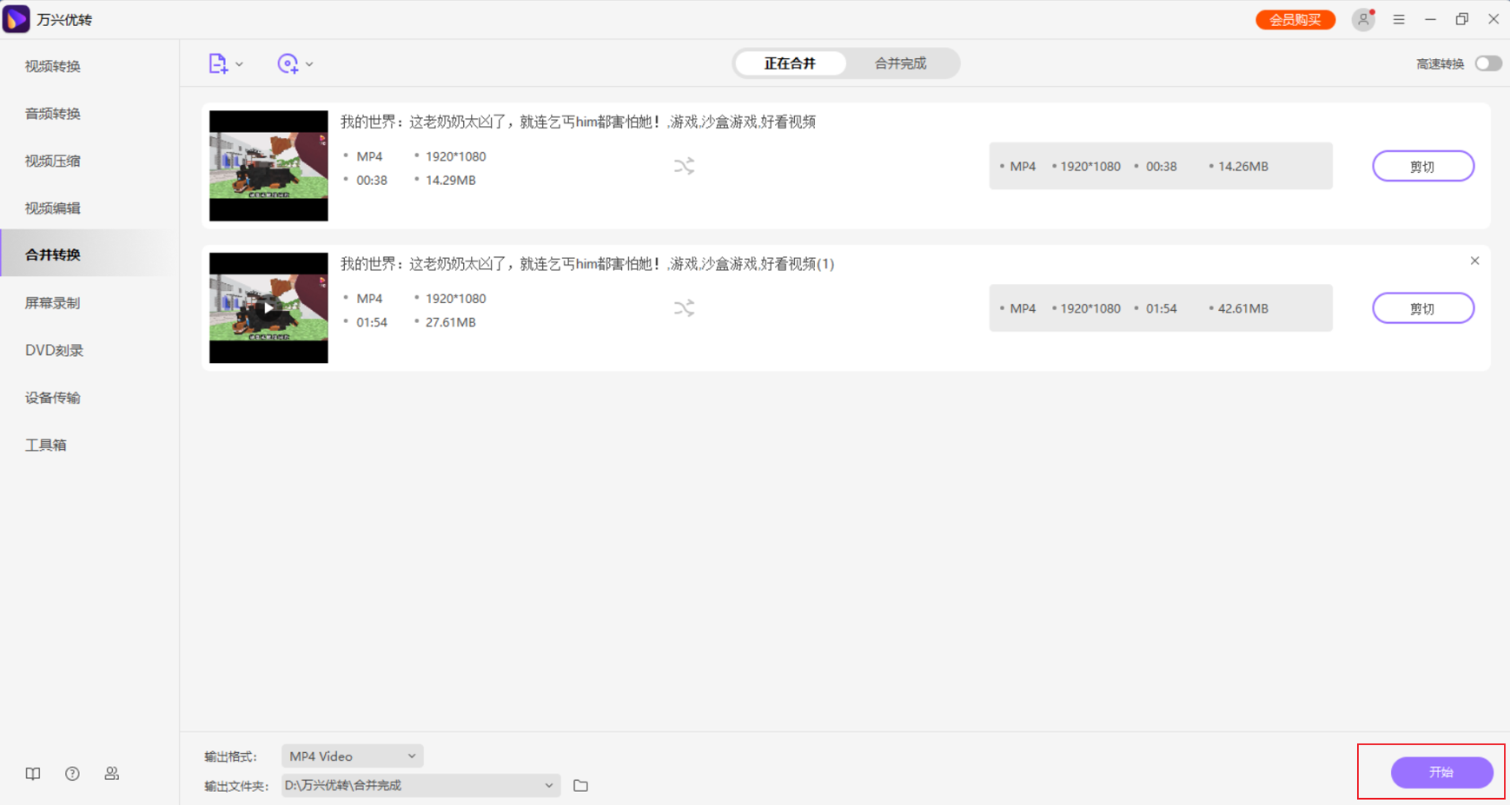 点击开始按钮就可以进行合并了,合并的时间与视频文件的大小有关系,耐心等待即可。