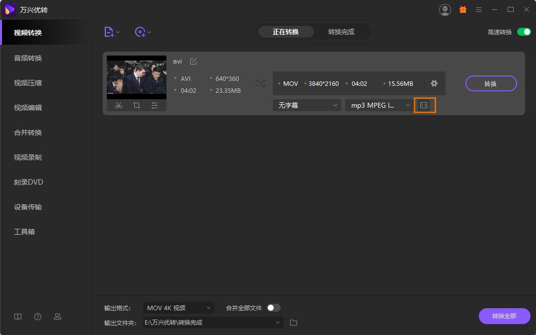 加载视频文件并选择输出格式后,你将可以在主界面看到输出文件的大小,同时点击标记的图标你可以手动更改输出文件的大小。