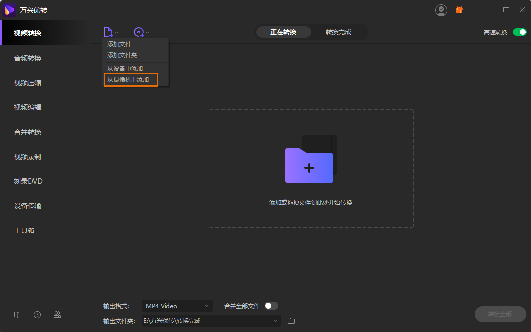 1、转到视频转换功能板块,点击添加文件旁的下拉列表并选择“从摄象机中添加”。