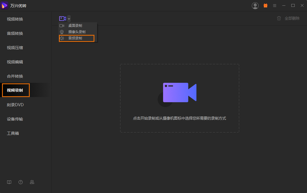 启动日韩免费视频观看优转,并从左侧面板选择视频录制板块。单击中间面板左上角的摄像机图标旁边的下拉箭头,然后从出现的列表中单击音频录制。