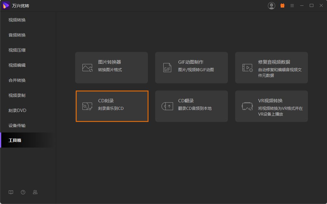 启动日韩免费视频观看优转,在产品主界面右侧选择工具箱板块,点击其中的CD刻录功能。