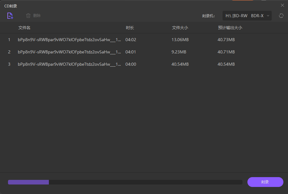您添加的所有音频文件将显示名称、艺术家、时间和大小。您可以通过点击左上角的图标来删除或添加更多的文件。选择文件后,插入一张空白CD到您的计算机,并从右上角选择刻录器。