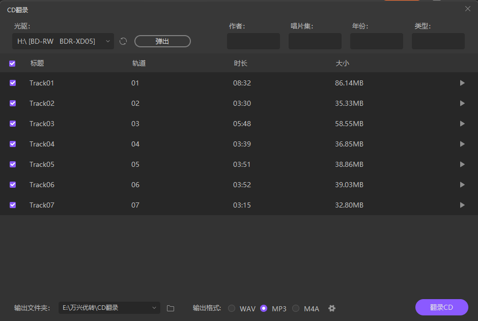在您将CD插入系统后,所有的音频文件将在界面上列出。文件显示时带有标题、音轨、持续时间和大小。默认情况下,选择要转换的所有文件。点击播放图标可以预览和播放文件。