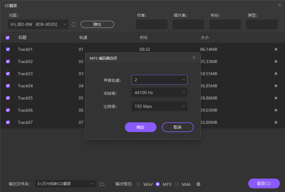在输出选项卡中选择文件输出文件夹。最后,点击CD翻录按钮开始转换CD到音频文件而不失去质量。