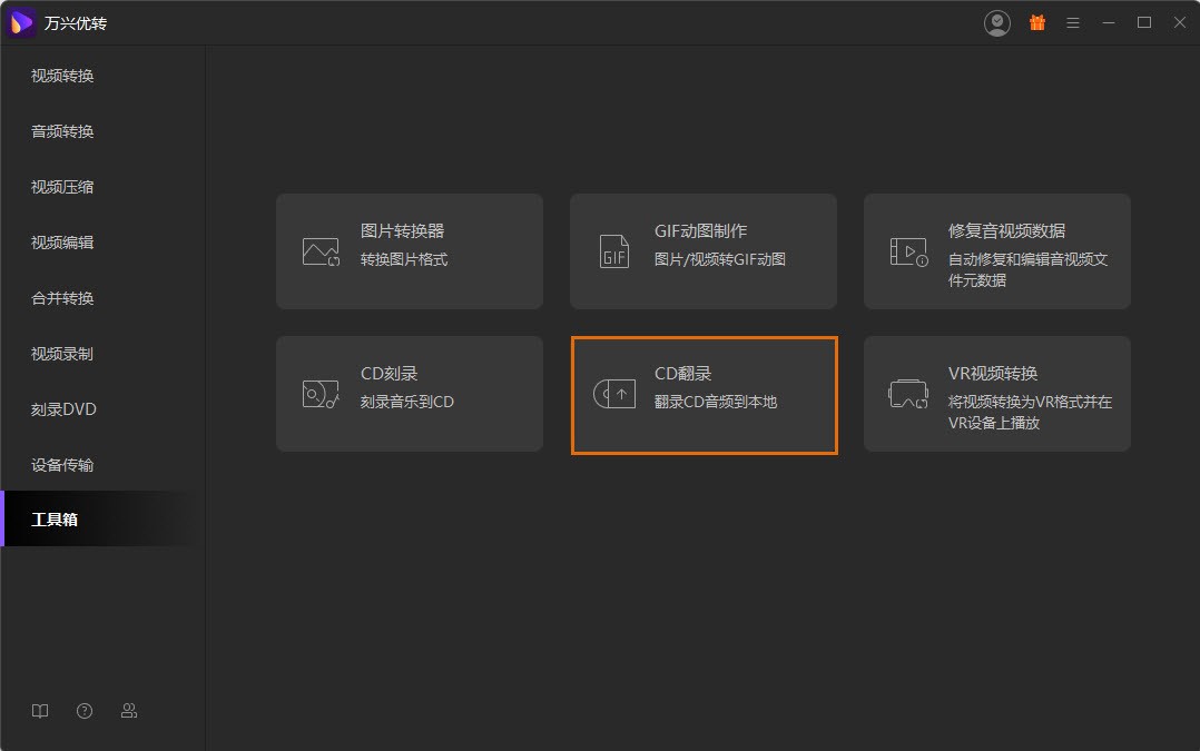 在你的系统上运行已安装的日韩免费视频观看优转,并从主界面上支持的主要功能列表中选择【工具箱】中的【CD翻录】功能。