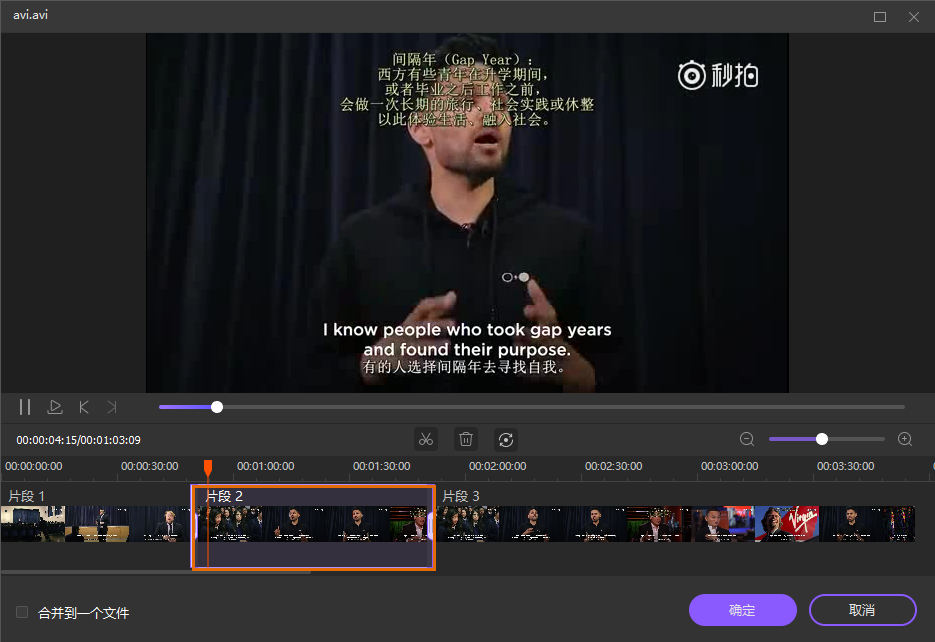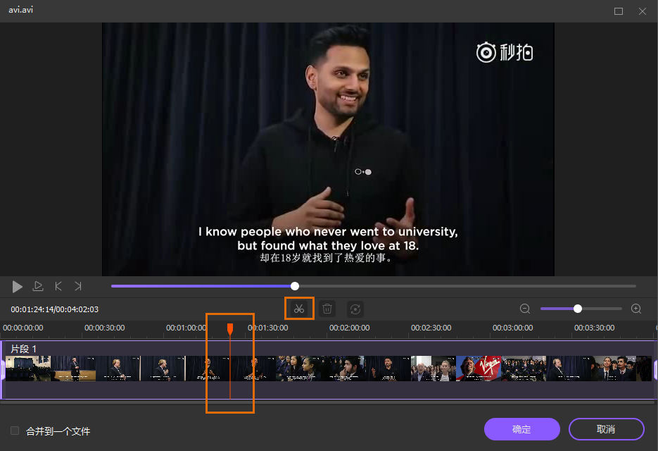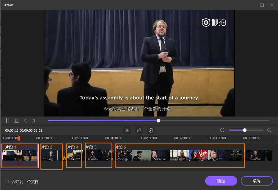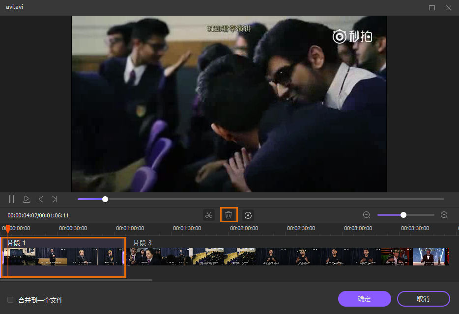 如果您想要删除视频中的一个片段,并将剩下的片段合并成一个视频,那么先选择不必要的片段并进行删除。然后选择左下角的“合并到一个文件”,并点击保存确认。