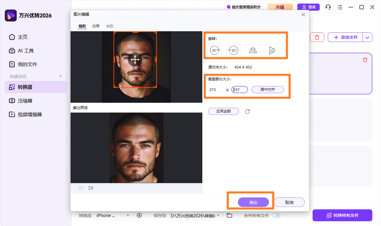 在转换列表中可查看图片缩略图,点击缩略图下方的【裁剪】按钮即可进入图片编辑器,对图片进行裁剪、旋转或调色等操作。