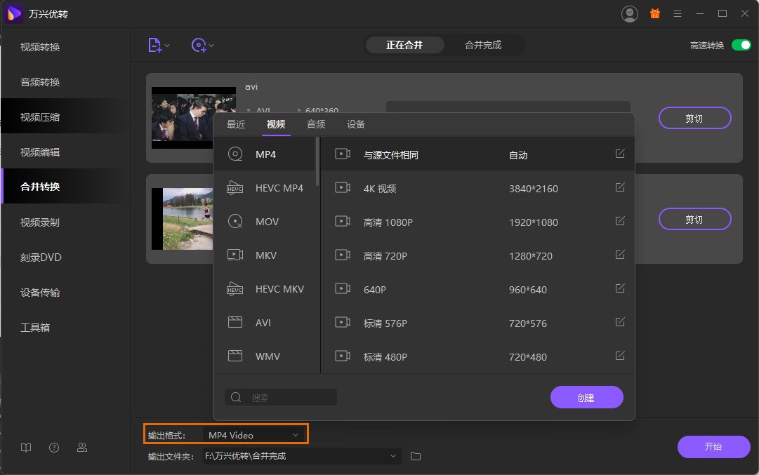 单击并打开主窗口底部的输出格式,转到视频选项卡,从左侧列表中选择一种输出格式,然后从右侧单击您想要合并的剪辑的分辨率。