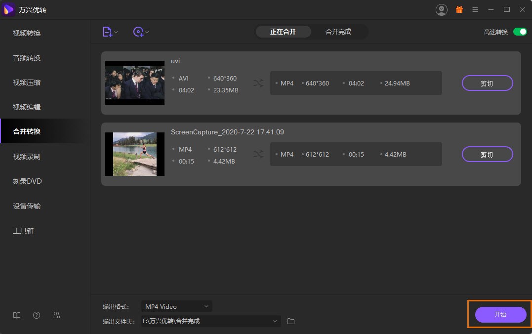 确保右上角的高速转换切换开关已打开,在界面底部的输出文件夹中选择一个目标文件夹,点击右下角的转换全部,将所有导入的视频片段合并为一个视频。