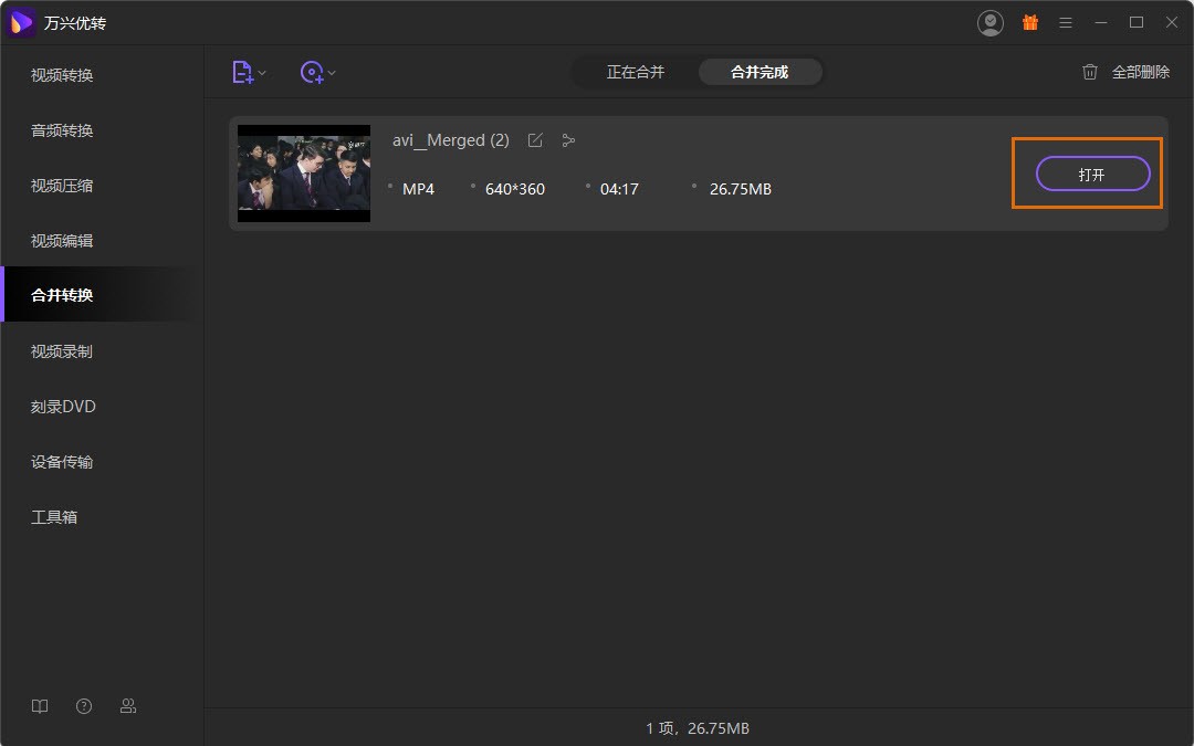 转换后,从顶部转到转换完成的选项卡,然后从合并的剪辑的右侧单击打开进入目标文件夹。