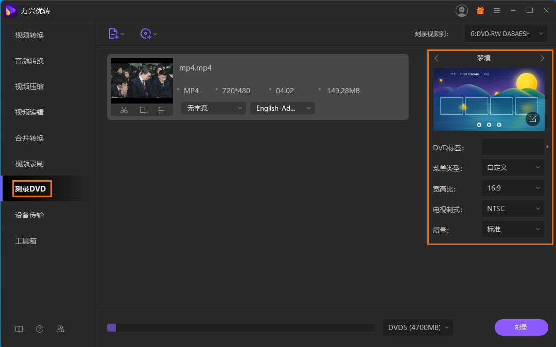 在DVD刻录功能板块,您可以刻录视频到DVD直接或刻录视频到DVD文件夹/iso文件夹。