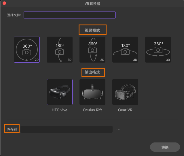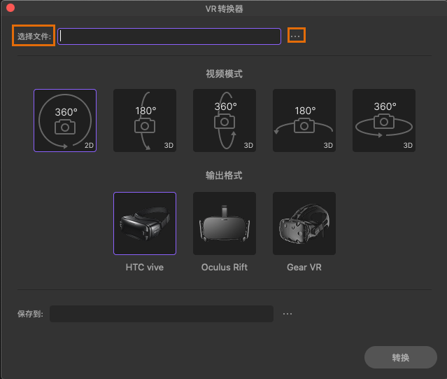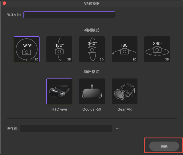 接下来,从给定的选项中选择视频模式和VR设备。在“保存到”选项卡,你可以选择文件位置将转换后的视频保存到Mac电脑上。